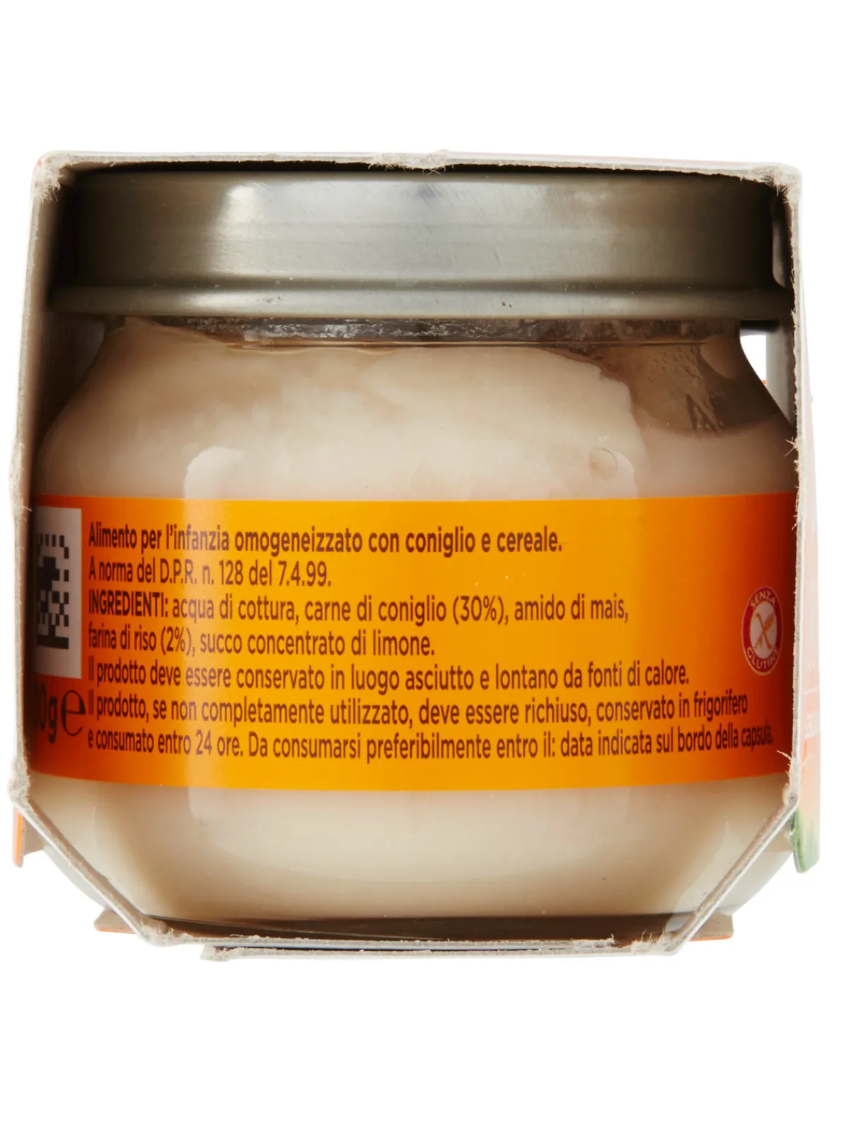 Prodotto omogeneizzato con carne di coniglio. Prodotto indicato a partire dal 4° mese compiuto, salvo diverso parere del Pediatra. – Omogeneizzato di carne – Prodotto sterilizzato; Non usiamo coloranti, né conservanti, come per legge sugli alimenti per l’infanzia. Senza sale aggiunto. .Confezione da 160 g (2 vasetti da 80g cad.)