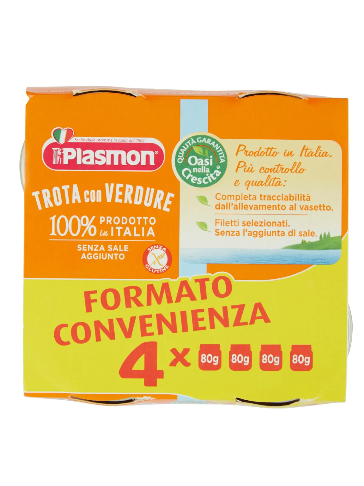 Alimento per l’infanzia omogeneizzato Trota e Verdure. Prodotto indicato a partire dal 6° mese compiuto, salvo diverso parere del Pediatra. – Omogeneizzato di pesce – Prodotto sterilizzato; Non usiamo coloranti, né conservanti, come per legge sugli alimenti per l’infanzia. Senza sale aggiunto. .Confezione da 320 g (4 vasetti da 80g cad.)