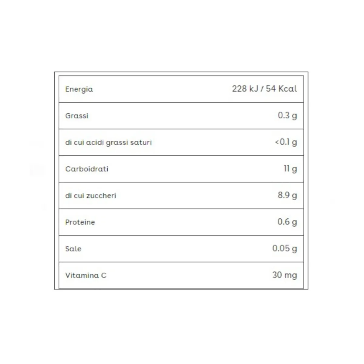 Prodotto sterilizzato; senza coloranti, né conservanti, come per legge sugli alimenti per l’infanzia. Solo zuccheri della frutta. Senza aromi.