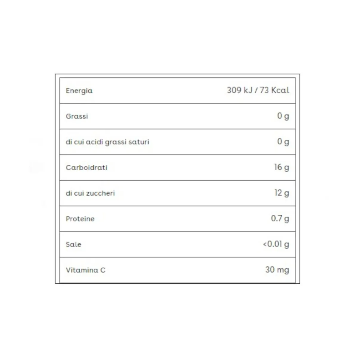 Prodotto sterilizzato; senza coloranti, né conservanti, come per legge sugli alimenti per l’infanzia. Solo zuccheri della frutta. Senza aromi.