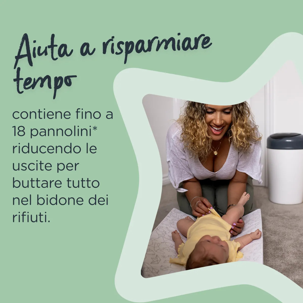 Il mangiapannolini è disponibile con una ricarica già installata. Il mangiapannolini Simplee Sangenic è compatibile solo con le cassette di ricarica Simplee Sangenic . Le cassette di ricarica Simplee Sangenic per mangiapannolini sono adatte solo per l’uso nei mangiapannolini Simplee Sangenic e non sono idonee per i mangiapannolini Sangenic TEC o Twist & Click. Le ricariche per mangiapannolini offrono un ottimo rapporto qualità-prezzo poiché ogni cassetta ha la capacità di smaltire fino a 180 pannolini*.