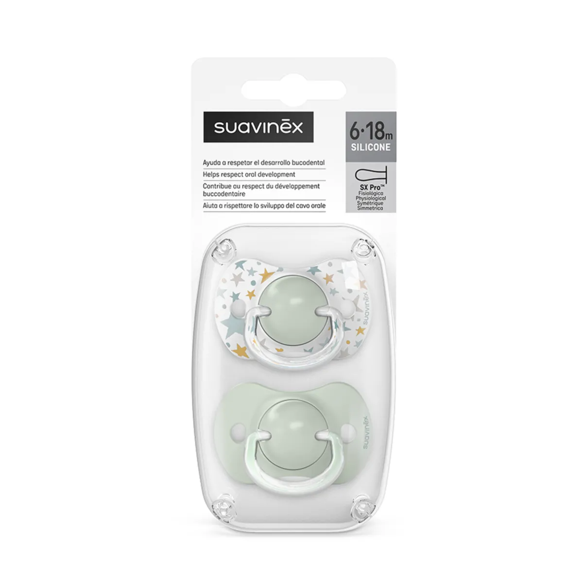 Confezione di 2 succhietti con tettina simmetrica in silicone SX Pro, per Bambini da 6/18 Mesi, Rispetta lo sviluppo del cavo orale del bambino; la tettarella SIMMETICA sx PRO è progettata per non invadere il cavo orale e fornire al bambino la stessa sensazione che prova nel suo stato naturale o fisiologico quando non ha il succhietto. con tettina simmetrica SXPro; collo sottile e largo, testina corta e piatta che permette alla bocca di chiudersi quasi completamente; reversibile, non importa da che parte si gira il ciuccio e se il bambino lo gira, rimane sempre ben posizionato silicone sabbiato ultra morbido; imita il capezzolo materno nella consistenza e al tatto; massima flessibilità per adattarsi al palato REVERSIBILE; la tettarella piatta e simmetrica si adatta sempre bene alla bocca del bambino, se il bambino la gira non succede nulla