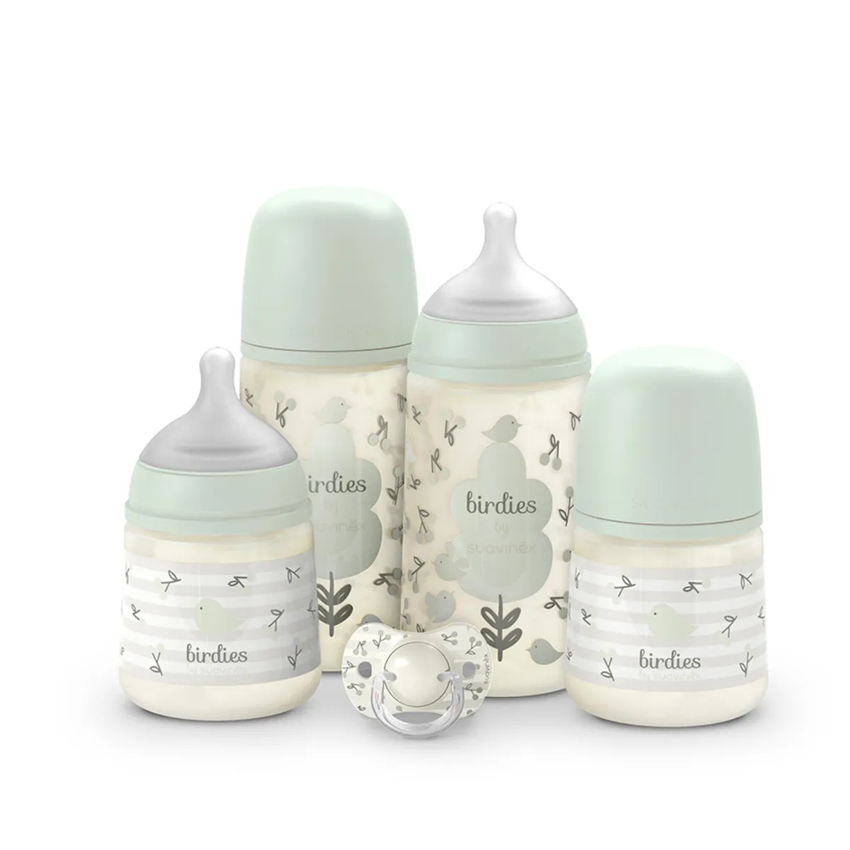 Set regalo ideale per la nascita. Contiene: 2 biberon 150ml con tettarella sx pro flusso S (ideale per neonati) un succhietto 0-6 mesi con tettina sx pro in silicone simmetrica e 2 biberon 270ml con tettarellla in silicone sx pro flusso M (ideale dai 3 mesi) . Variante verde