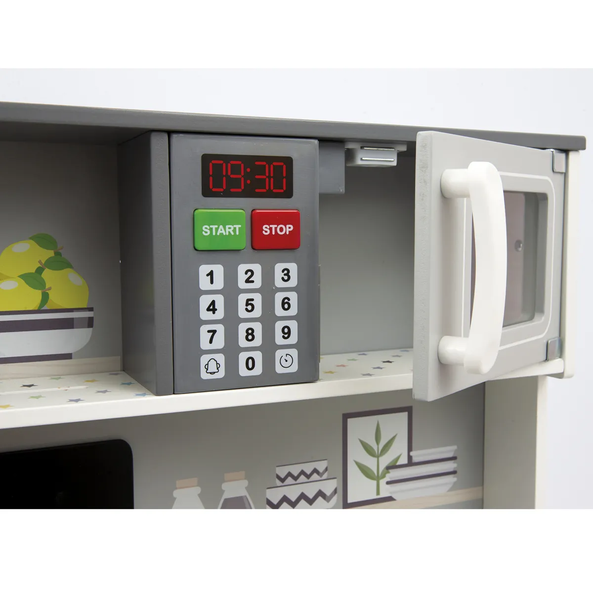 Cucina Gioco Wood ‘n Play: perfetta per piccoli chef in erba! Questa cucina in legno è una replica realistica di una moderna cucina da chef. Con lavello estraibile, piano cottura a induzione illuminato e fornelli con suoni realistici di cottura, i bambini saranno immersi in un’esperienza coinvolgente. Gli effetti sonori e le luci aggiungono un tocco di realismo mentre i bambini imparano giocando.