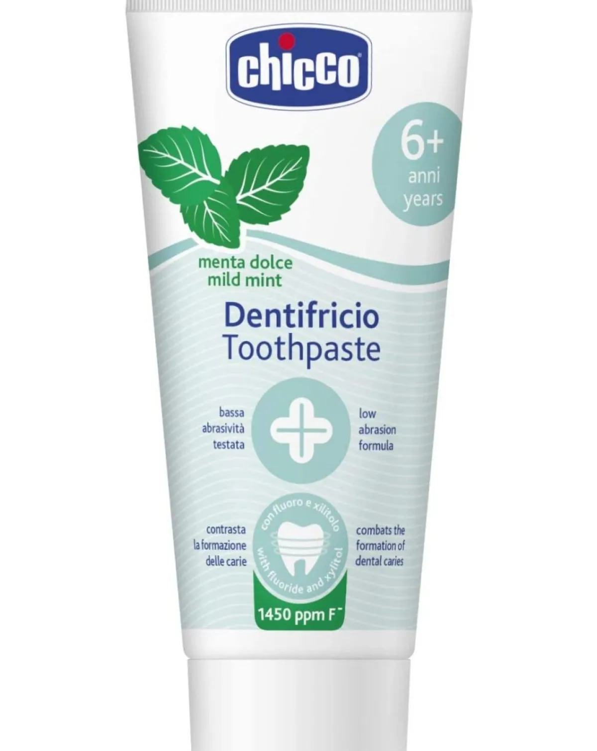 Il dentifricio chicco al gusto menta dolce rimuove la placca senza intaccare lo smalto. Ha una bassa abrasività testata per non danneggiare i denti definitivi. Aiuta a contrastare la formazione delle carie grazie al fluoruro di sodio (1450 ppm f- ) e allo xilitolo. Grazie al calcio biocompatibile, contribuisce a preservare lo smalto e con vitamina e e betaina che aiutano a proteggere le gengive. Adatto ai bambini dai 6 anni in su.