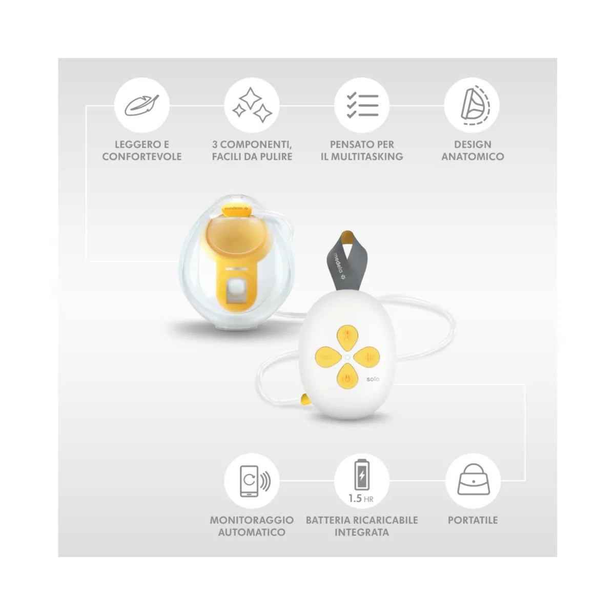 Tiralatte elettrico singolo Solo Hands-free di Medela: la soluzione a mani libere, ideale per l’estrazione occasionale. Il nostro tiralatte Solo è elegante, compatto e intuitivo ed è abbinato alla coppa raccoglilatte Hands-free Medela – progettata anatomicamente per supportare un’efficace estrazione del latte, ultraleggera* per essere confortevole e facile da pulire con solo tre componenti.