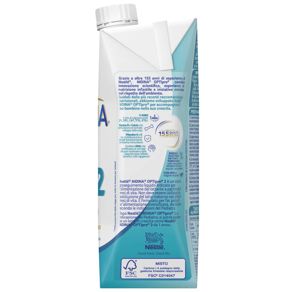 Nestlé Nidina Optipro 2 è un latte di proseguimento in formato liquido indicato per l’alimentazione del lattante a partire da 6 mesi di vita. È formulato per far parte di una alimentazione diversificata, da iniziare secondo le indicazioni del Pediatra. Non deve essere utilizzato in sostituzione del latte materno nei primi 6 mesi di vita.