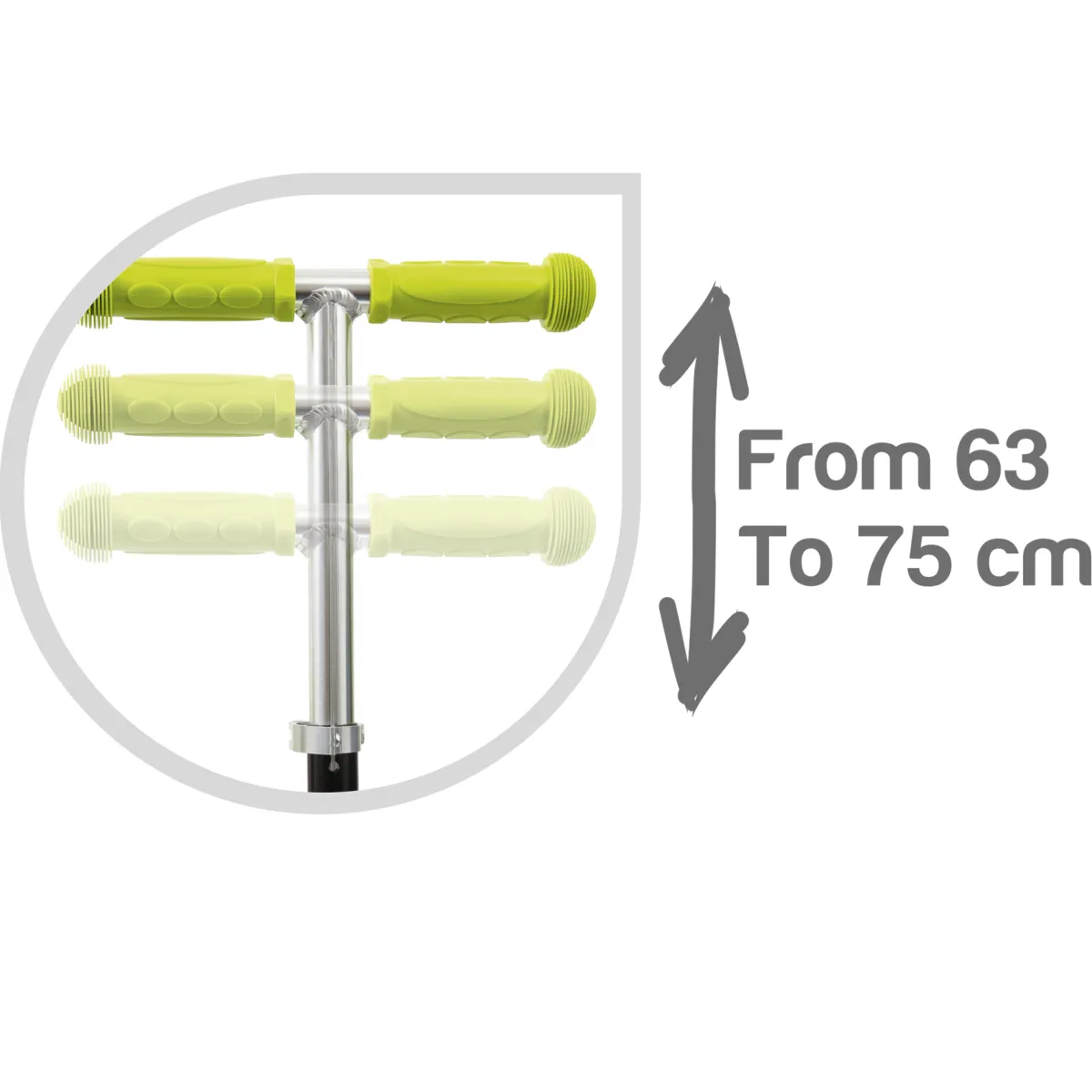 Con le manopole richiudibili e la struttura pieghevole, questo monopattino è facile da riporre e trasportare ovunque. L’altezza regolabile da 63 a 75 cm cresce con il tuo bambino, garantendo comfort a lungo termine.